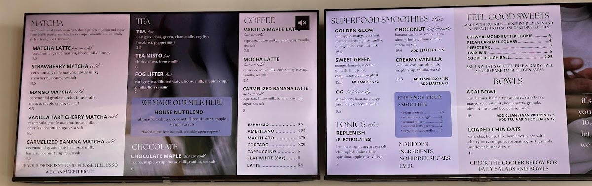 If you’re thirsty for something refreshing, their Iced Tonics are the perfect choice. The Replenish tonic, featuring blue spirulina, fresh lemon juice, and a hint of coconut nectar, provides a refreshing burst of flavor, all while supporting your health journey. Each iced drink comes in a standard 16 oz size for just CA$10.00, making them not only a treat for your palate but also for your wellbeing.